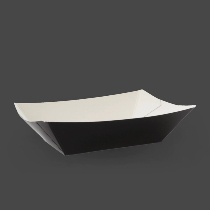 These small black open chip trays are ideal for serving chips, fries and other hot takeaway snacks. The open design allows for easy access and quick service, making them perfect for food stalls, takeaways and busy catering events. Made from sturdy cardboard, they provide reliable support for hot food while maintaining their shape during handling. The sleek black finish offers a modern, professional look that enhances presentation and suits a wide range of food-to-go environments.
